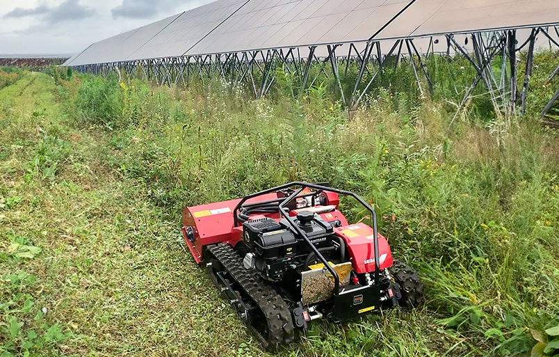 雑草は放置を続けるとフェンスに絡まったり景観が悪くなるだけでなく、影によるソーラーパネルの発電量低下にも影響します。さらに害虫の発生要因となり近隣各所への迷惑やクレームにつながるため、定期的な除草作業は必須です。当社では搭乗タイプのハンマーナイフモア草刈り機と刈払い機に加え、作業者の安全・作業の効率化を図るために、新たにリモコン草刈り機を導入しました。